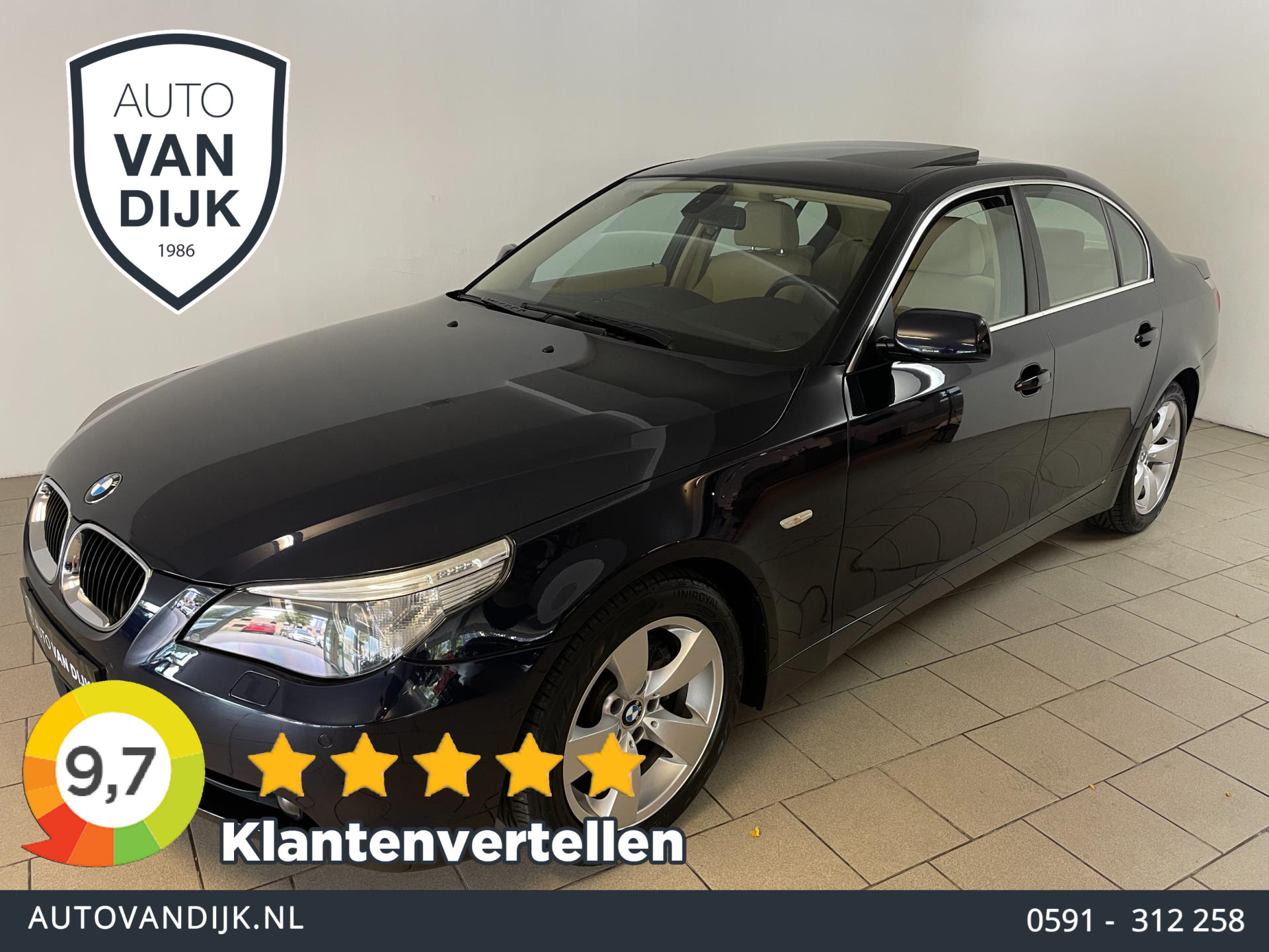 BMW 5-serie 520i 6 cilinder. We hebben weer zo'n nette BMW 5 serie binnen gekregen. Hij ziet er niet alleen keurig uit, hij rijdt ook perfect en heeft veel leuke opties. Onder de motorkap van deze BMW 5-serie zit een heerlijke 6 cilinder benzine motor en het rijden is een waar genot! En de opties, die maken deze BMW helemaal af! Airco, navigatie, cruise control, velgen, schuif-kanteldak, parkeersensoren, wegklapbare, 17 inch velgen, regensensor, radiobediening op het stuur en zo gaat het nog wel even door met de vele opties! De vorige eigenaren zijn altijd erg zuinig geweest op de BMW, van binnen en buiten ziet hij er zeer netjes uit! Wat een heerlijke auto is deze BMW! Bekijk snel alle foto's en maak een afspraak voor de proefrit!