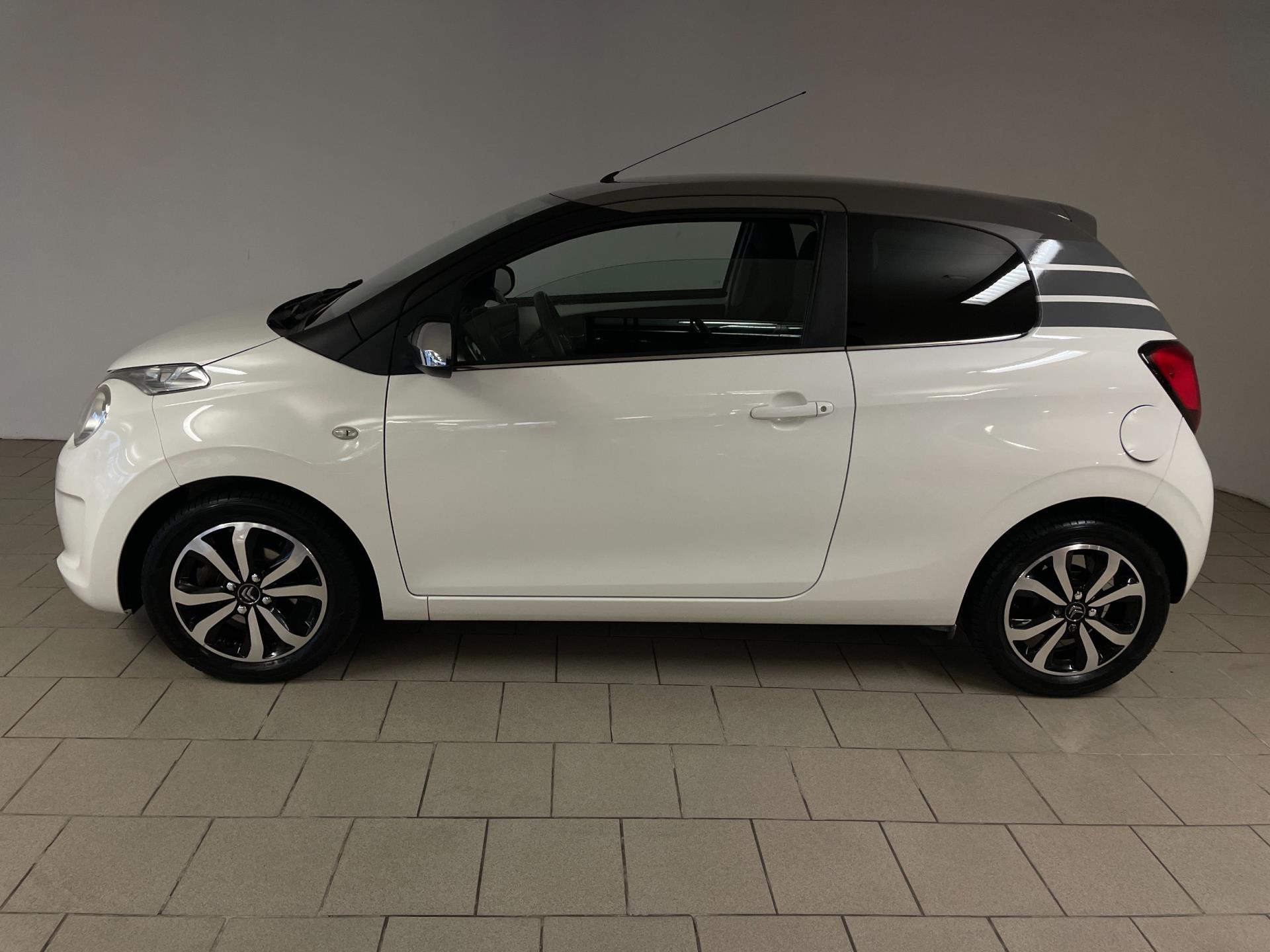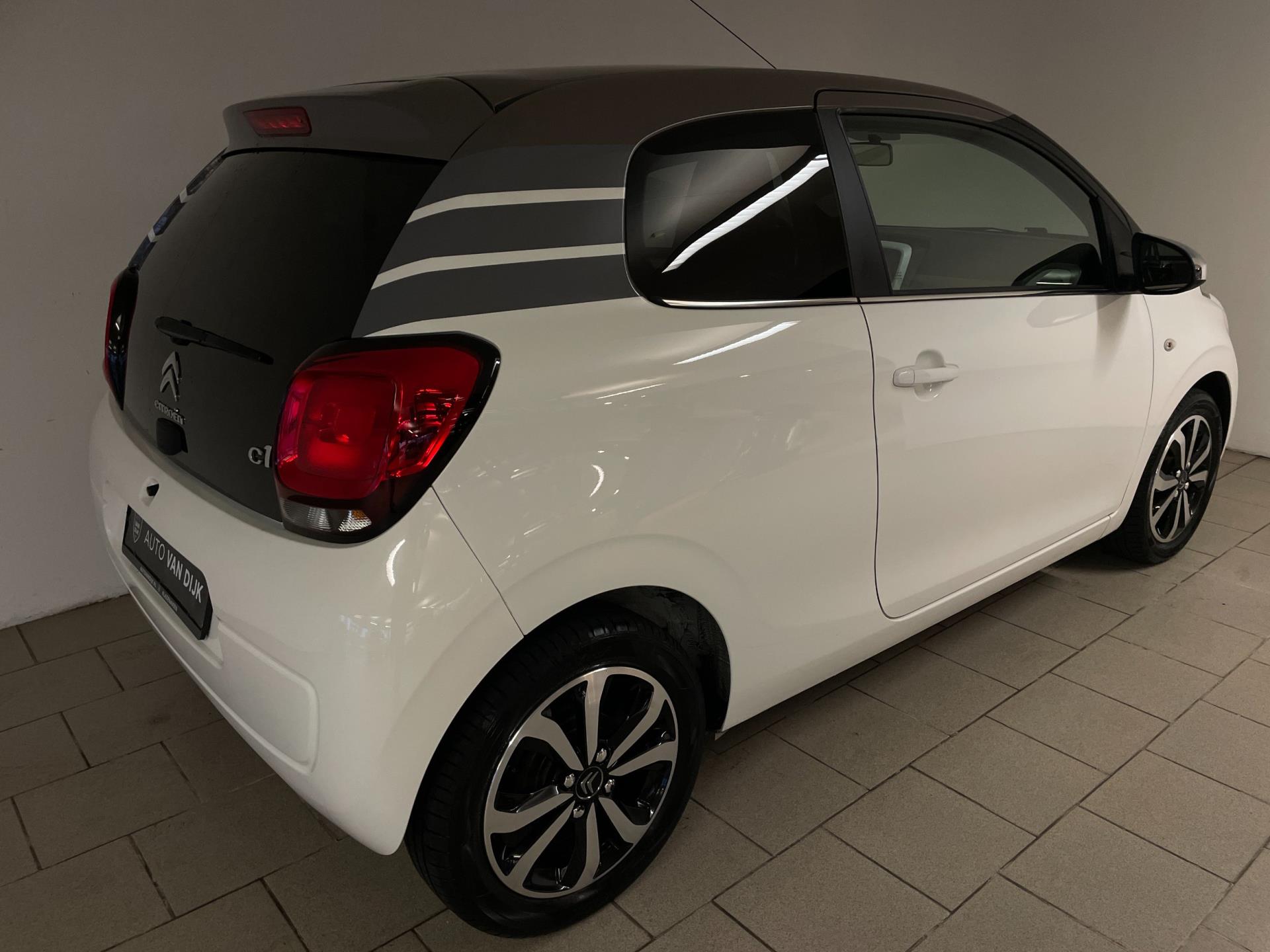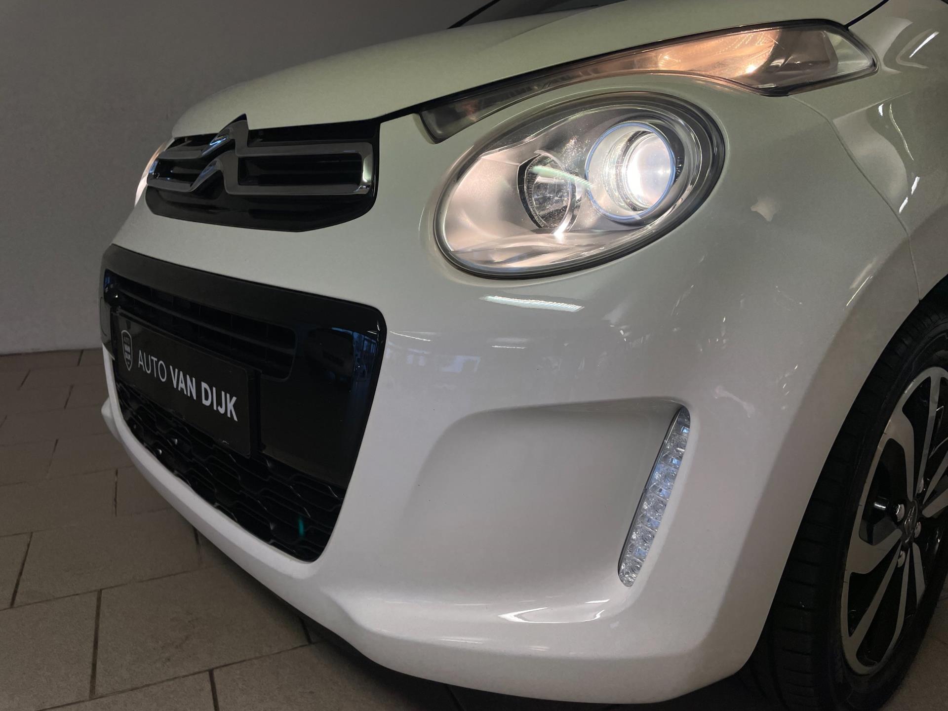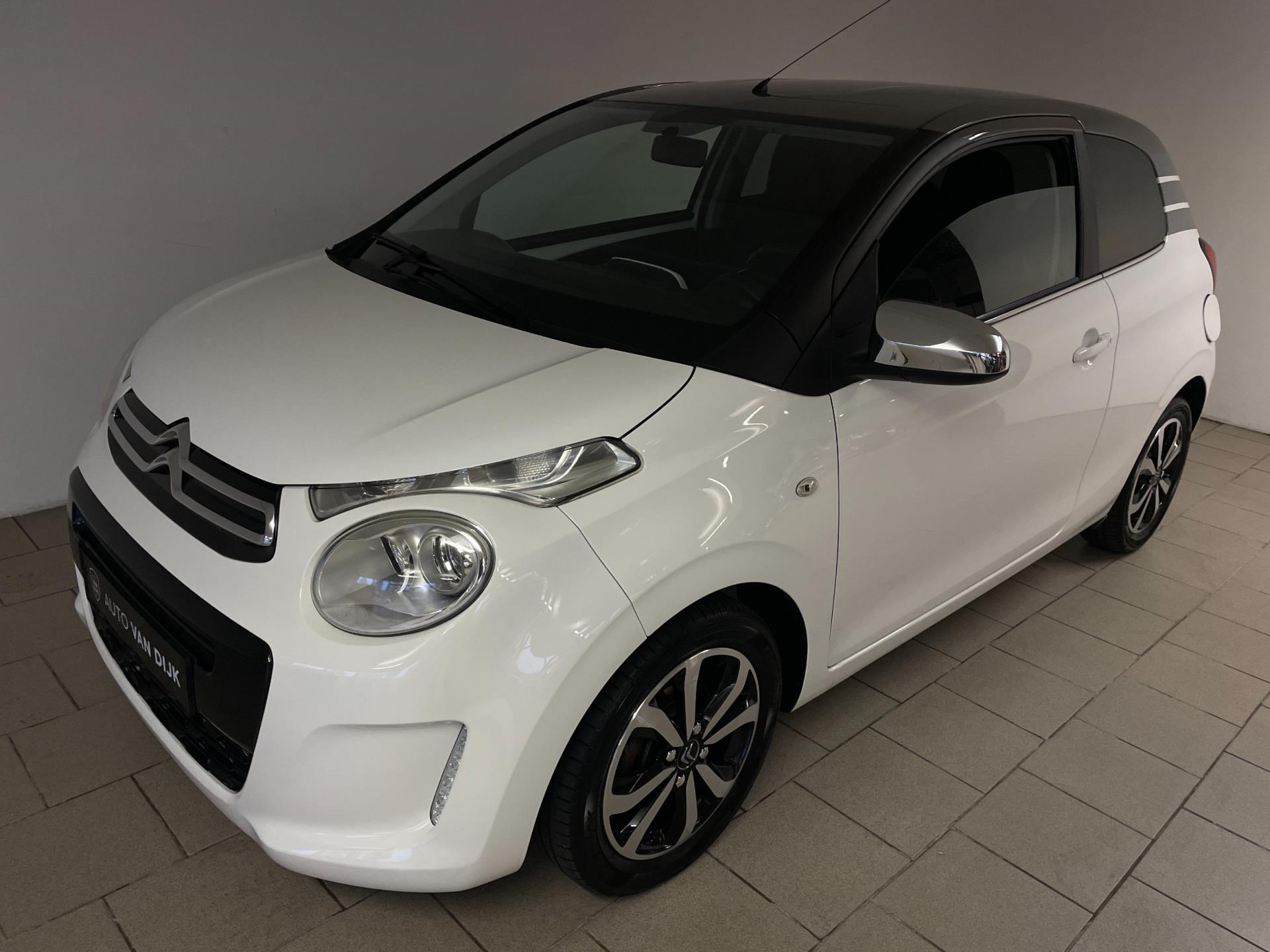 Citroën C1 1.0 e-VTI. De witte lak, het bruine dak, de lichtmetalen velgen, het privacy glas en de chroom accenten maken deze kleine Citroën tot een echte blikvanger! Navigatie, airco clima, Bluetooth, achteruitrij-camera, elektrische ramen, centrale vergrendeling, limiter, mistlampen, led dagrijverlichting, speciaal interieur en een in hoogte verstelbare bestuurdersstoel zijn een aantal van de vele opties die je kan vinden op deze C1. Je kan erg voordelig rijden met zo'n C1, de wegenbelasting is slechts 20 euro per maand, hij is erg zuinig (1:20) en de onderhoudskosten zijn zeer laag. De vorige eigenaresse is altijd erg zuinig geweest op de auto, van binnen en buiten ziet hij er nog als nieuw uit! Ben je opzoek naar een zuinige en betrouwbare auto? Hou je van een chique uiterlijk? Wil je graag een auto met veel opties? Dan heb je hem nu gevonden! Kom langs in onze showroom voor deze luxe C1!