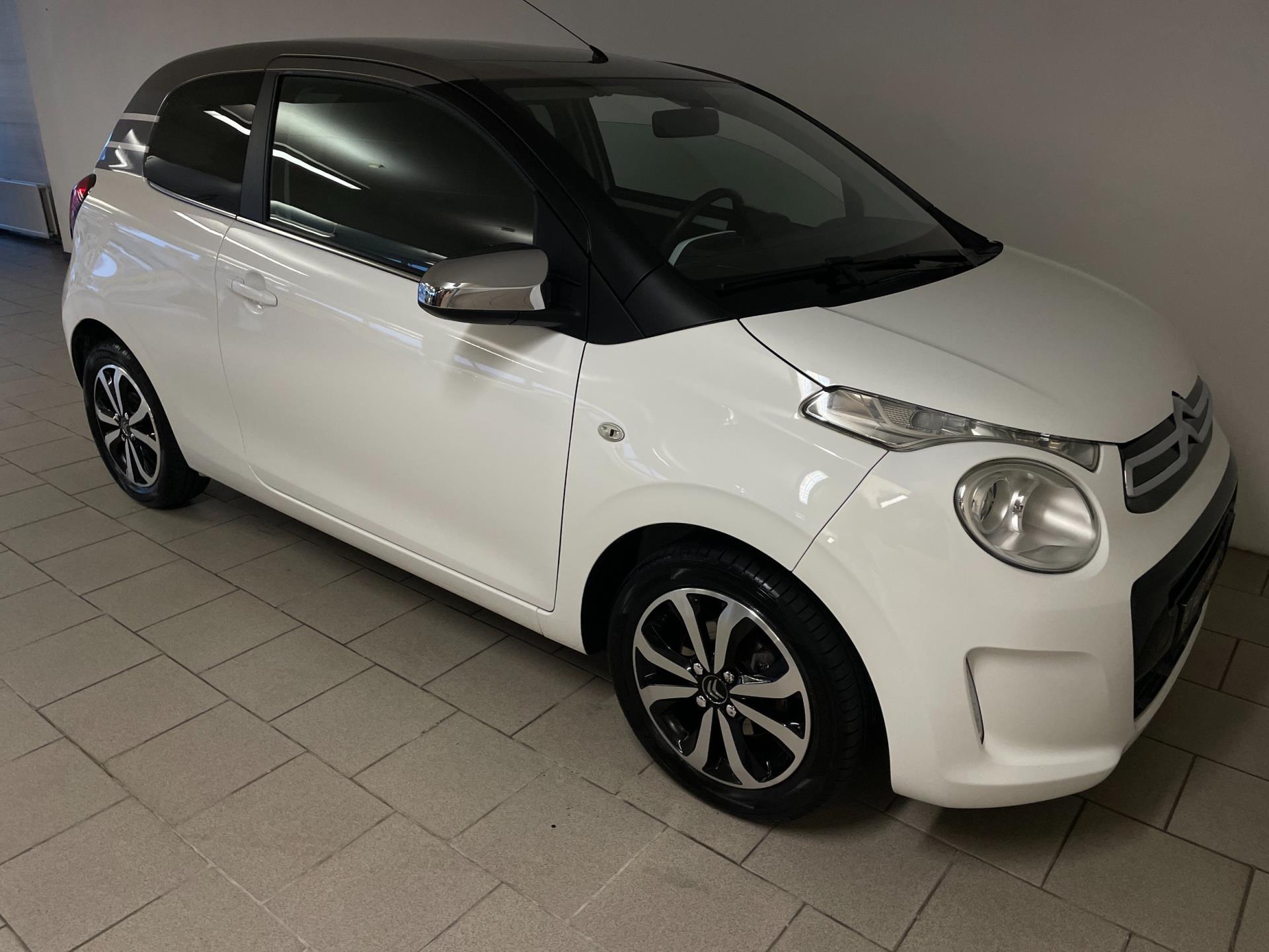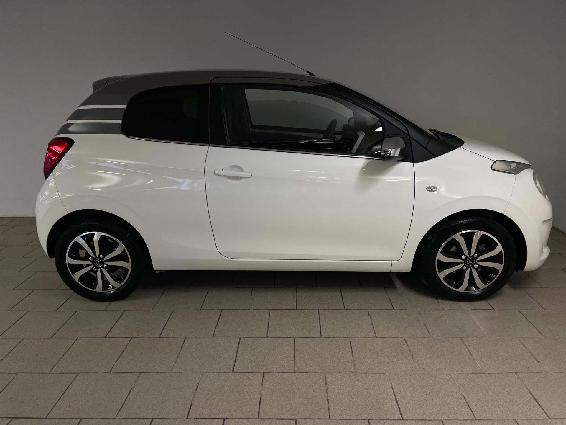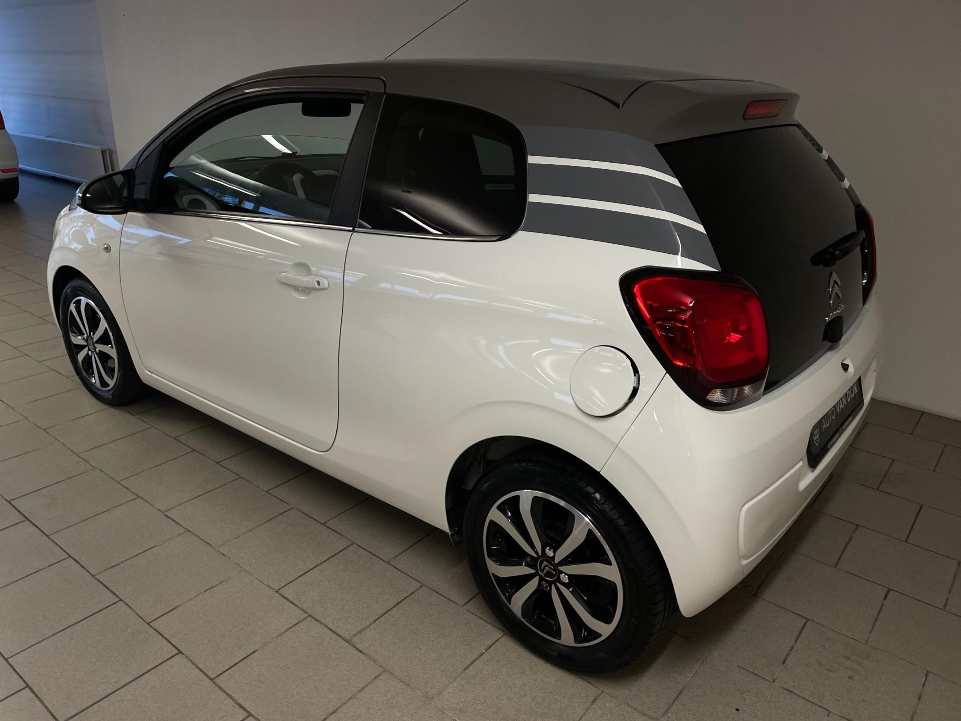 Citroën C1 1.0 e-VTI. De witte lak, het bruine dak, de lichtmetalen velgen, het privacy glas en de chroom accenten maken deze kleine Citroën tot een echte blikvanger! Navigatie, airco clima, Bluetooth, achteruitrij-camera, elektrische ramen, centrale vergrendeling, limiter, mistlampen, led dagrijverlichting, speciaal interieur en een in hoogte verstelbare bestuurdersstoel zijn een aantal van de vele opties die je kan vinden op deze C1. Je kan erg voordelig rijden met zo'n C1, de wegenbelasting is slechts 20 euro per maand, hij is erg zuinig (1:20) en de onderhoudskosten zijn zeer laag. De vorige eigenaresse is altijd erg zuinig geweest op de auto, van binnen en buiten ziet hij er nog als nieuw uit! Ben je opzoek naar een zuinige en betrouwbare auto? Hou je van een chique uiterlijk? Wil je graag een auto met veel opties? Dan heb je hem nu gevonden! Kom langs in onze showroom voor deze luxe C1!