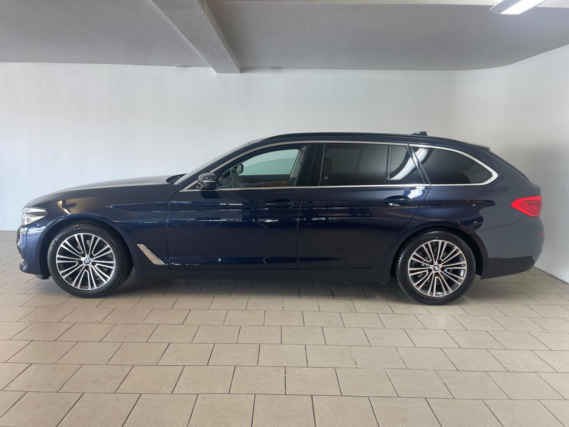 BMW 520i High Executive Touring. Snel, luxe en sportief, zo kan je deze 5-serie samenvatten. De soepele benzinemotor levert 184pk en dat maakt hem in combinatie met de automatische versnellingsbak lekker vlot en krachtig. De vorige eigenaar heeft de BMW erg mooi afgestyled. De donker blauwe metallic lak, lichtmetalen chroom/lak velgen en het privacy glas geven hem een luxe en tegelijkertijd ook sportieve uiterlijk. Lederen interieur met comfortstoelen, stoelverwarming, stoelventilatie, stuurverwarming, airco met climate control, beige dakhemel, navigatie, Bluetooth, elektrische achterklep, elektrische wegklapbare trekhaak, elektrisch bedienbare voorstoelen met geheugen, cruise-control, privacy glas en zo gaat nog wel even door met de opties op deze BMW. Nieuwsgierig geworden? Zin in een proefrit? Maak dan snel een afspraak en kom langs in de showroom voor deze BMW 520i High Executive!
