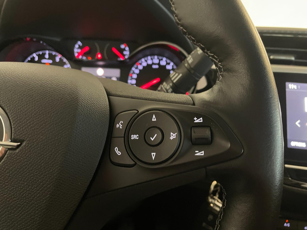 In deze witte lak, door de lichtmetalen velgen set en de achterklepspoiler komt het model erg goed tot zijn recht! Airco, navigatie, cruise-control, parkeersensoren, Apple Carplay, Android auto, Bluetooth, stuurverwarming, radiobediening op het stuur, zijn een aantal van de vele opties die je kan vinden op deze sportieve Corsa.