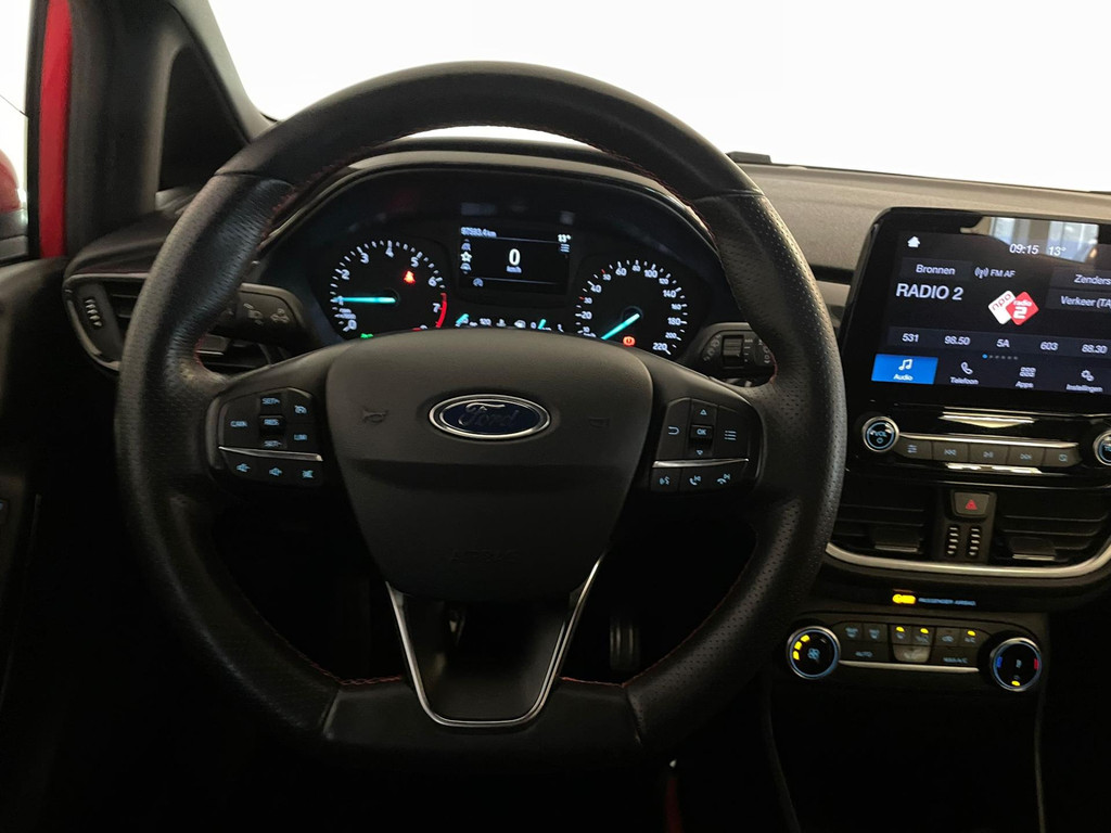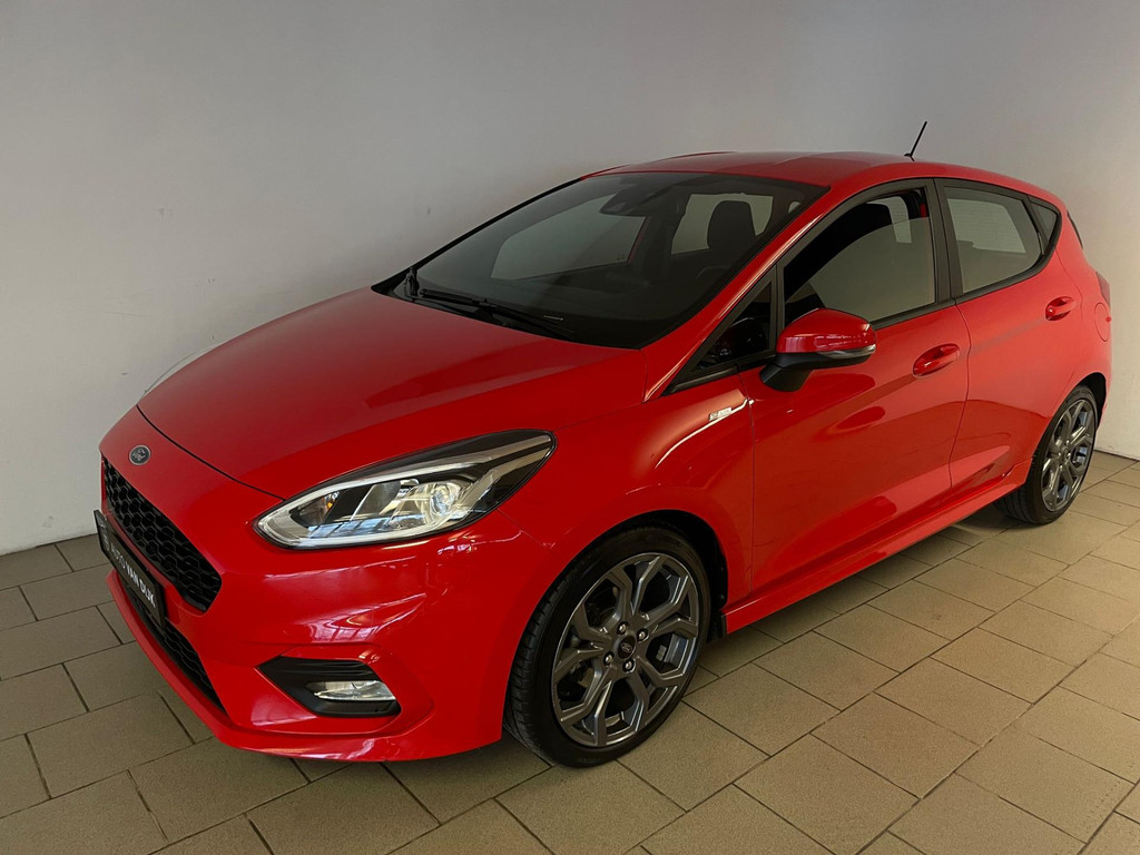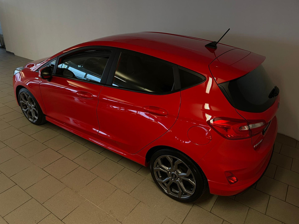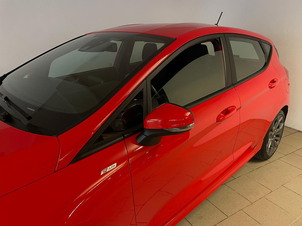 Ford Fiesta 1.0 EcoBoost ST Line 95PK. Zoek een compacte auto met veel pit en een sportieve uitstraling? Ben gek op rood? En wil je graag veel opties? Dan heb je hem nu gevonden! Deze Ford Fiesta ST Line heeft het allemaal! Doordat dit de ST-Line uitvoering is heeft hij een heel sportief uiterlijk! Sportbumper voor, sportbumper achter, grote achterklep spoiler, antraciete velgen, sideskirts en een sportinterieur zijn een aantal opties waaraan je deze uitvoering kunt herkennen! De 95pk sterke benzine motor geeft hem veel pit en je kan er toch ook nog steeds zuinig mee rijden. Airco met climate control, navigatie, Bluetooth, privacy glas, sport interieur, lederen sportstuur en zo gaat het nog wel even door met de vele opties die je kan vinden op deze sportieve Ford. Van binnen en buiten ziet de Ford er nog als nieuw uit! Nieuwsgierig geworden? Kom dan snel langs voor een proefrit!